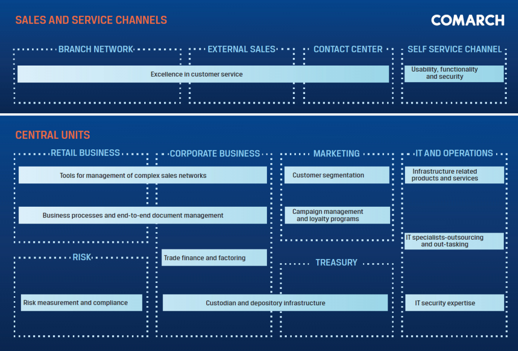 This diagram presents Comarch’s competencies in the banking sector: